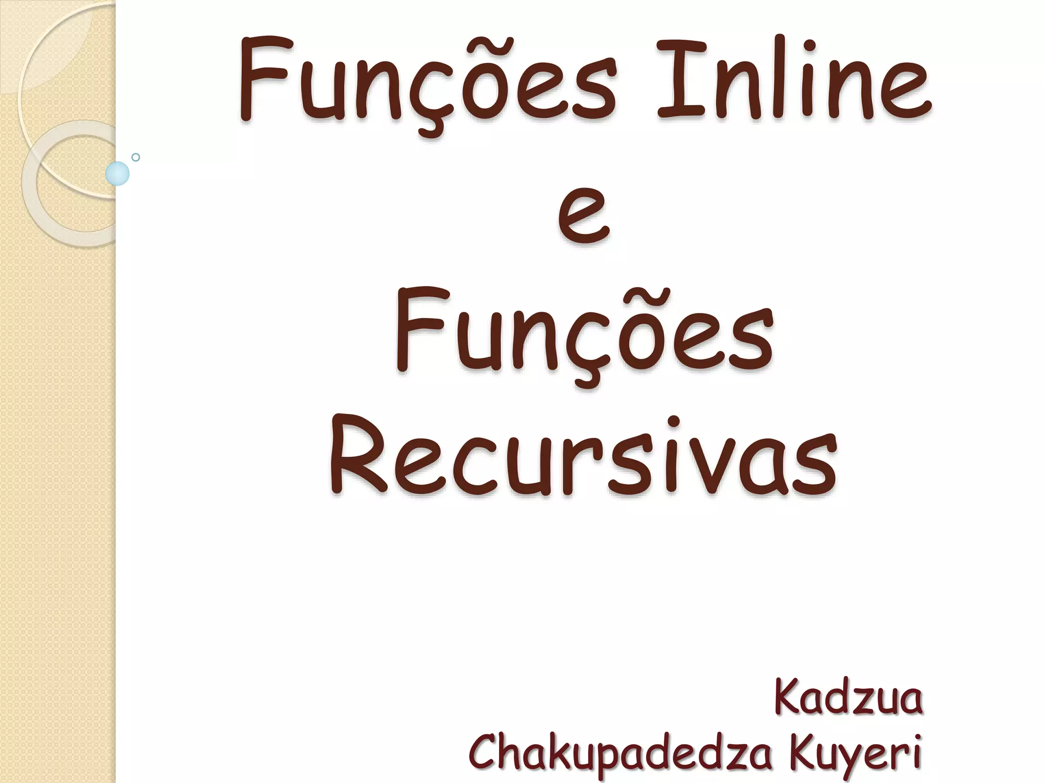 O documento discute funções inline e recursivas em C++. Funções inline têm seu código copiado no local da chamada para ganho de desempenho, enquanto funções recursivas chamam a si mesmas, permitindo algoritmos simples mas consumindo mais tempo de processamento. Exemplos demonstram o uso dessas funções.