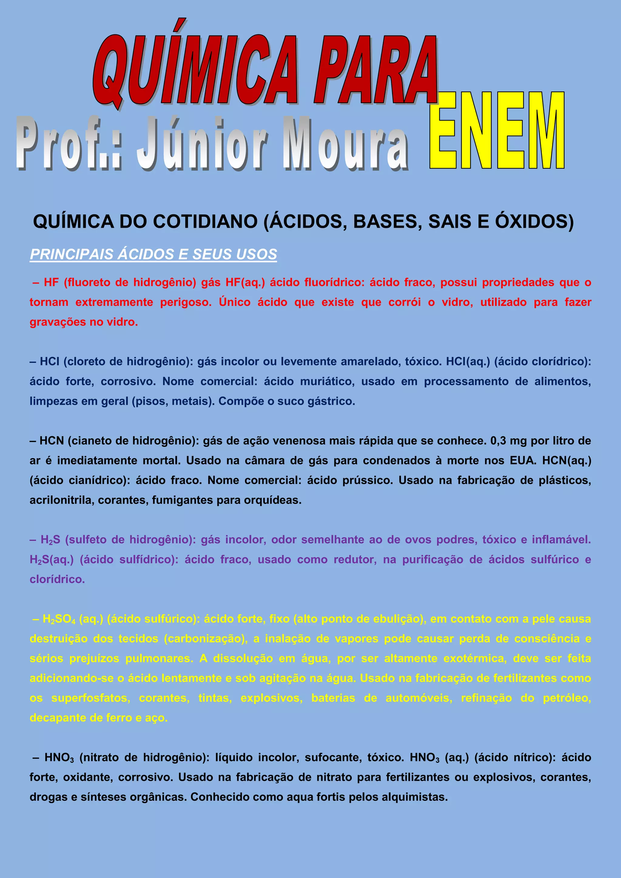 O documento descreve os principais ácidos, bases, sais e óxidos, incluindo suas fórmulas químicas, propriedades e usos. Os ácidos mais fortes descritos são H2SO4 e HNO3, enquanto HCN é o mais venenoso. As bases incluem NaOH, KOH e NH4OH. Os sais comumente usados são NaCl, NaNO3 e NaHCO3. Óxidos como CO2, N2O e H2O2 têm aplicações industriais e domésticas.