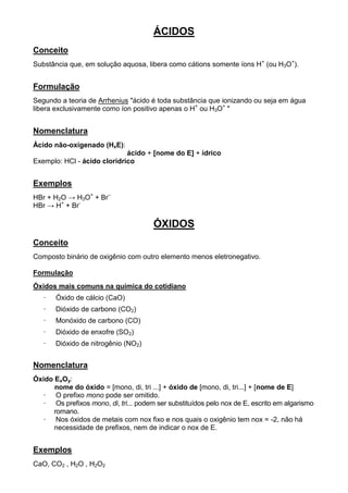 Este documento descreve diferentes tipos de compostos inorgânicos, incluindo bases, sais, ácidos e óxidos. Ele define cada um destes compostos, fornece exemplos de formulações e métodos de nomenclatura. Em particular, explica que bases liberam íons OH-, sais são formados pela neutralização de ácidos com bases, ácidos liberam íons H+ e a nomenclatura de óxidos depende do número de oxidação do elemento.