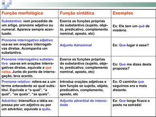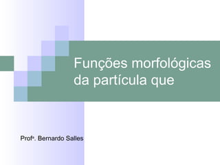 3) O documento fornece exemplos detalhados da função morfológica e sintática de "que" em diferentes contextos gramaticais.