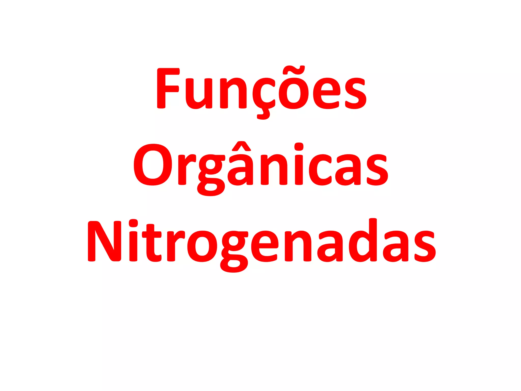 As funções orgânicas nitrogenadas se dividem em aminas, amidas e nitrocompostos. As aminas incluem cafeína e cocaína e derivam da amônia com substituição de hidrogênios. As amidas incluem a ureia e são usadas em fertilizantes e na indústria farmacêutica. Os nitrocompostos contém grupos nitro e incluem explosivos como o trinitro-tolueno.
