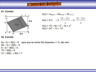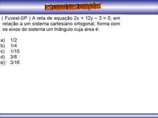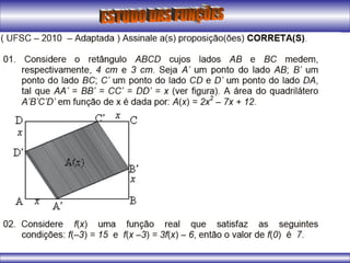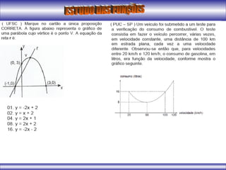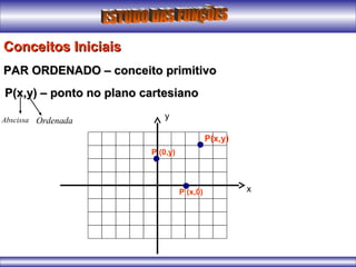 O documento apresenta conceitos iniciais sobre funções matemáticas, incluindo definição de função, exemplos de relações binárias que são ou não funções, elementos de uma função como domínio, contradomínio e conjunto imagem. Também apresenta exemplos de gráficos de funções do primeiro grau e conceitos sobre vértice de funções quadráticas.