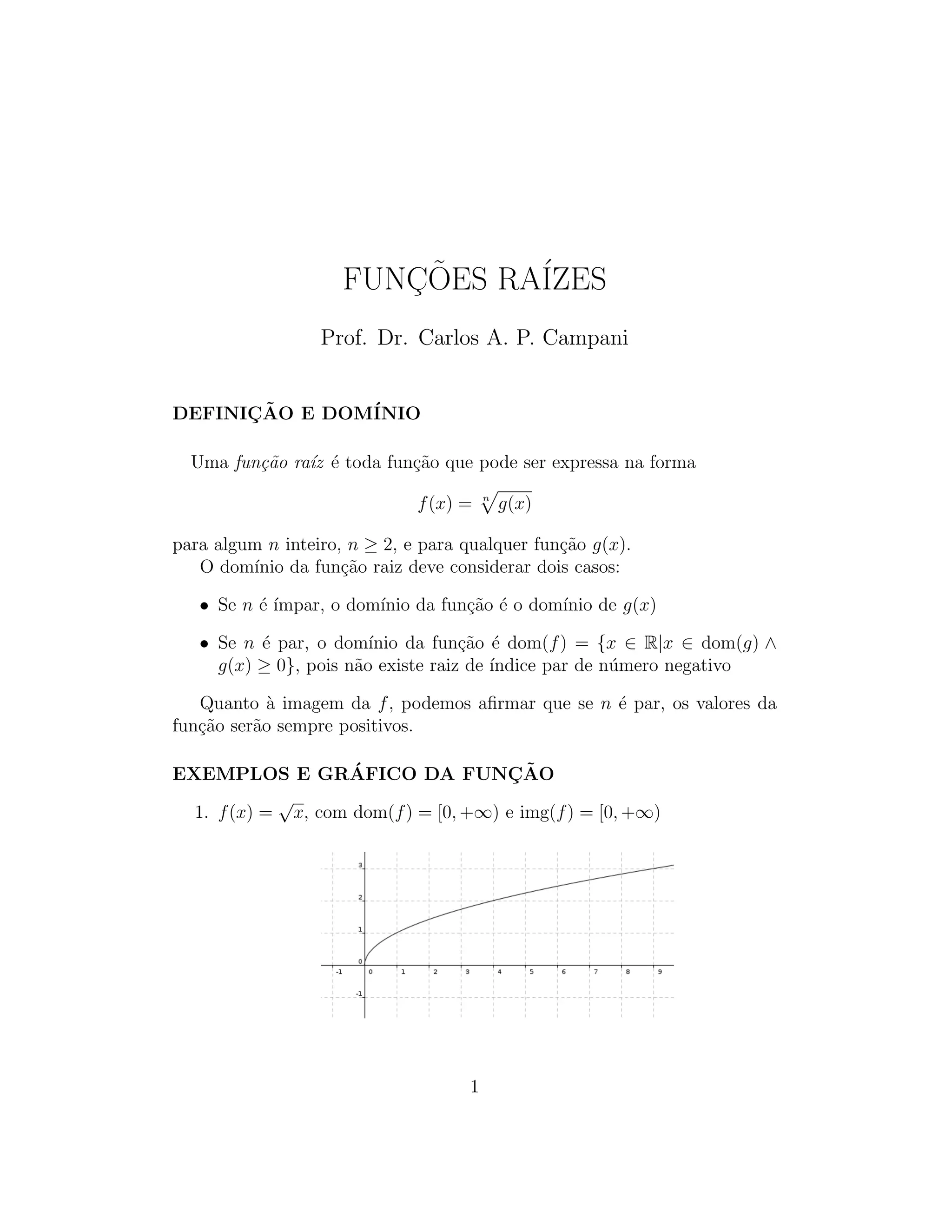 O documento define e discute funções raiz, que podem ser expressas na forma f(x) = n√g(x). O domínio depende de n ser ímpar ou par. Exemplos incluem f(x) = √x e f(x) = √2x + 5. Quanto menor o índice n, mais rápido a função cresce para infinito, como mostrado no gráfico.