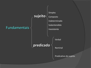 Este documento resume os principais tipos de sujeito, predicado e complementos na língua portuguesa, incluindo: 1) sujeitos simples, compostos, subentendidos e indeterminados; 2) predicados verbais e nominais; 3) complementos diretos, indiretos, circunstanciais e outros.