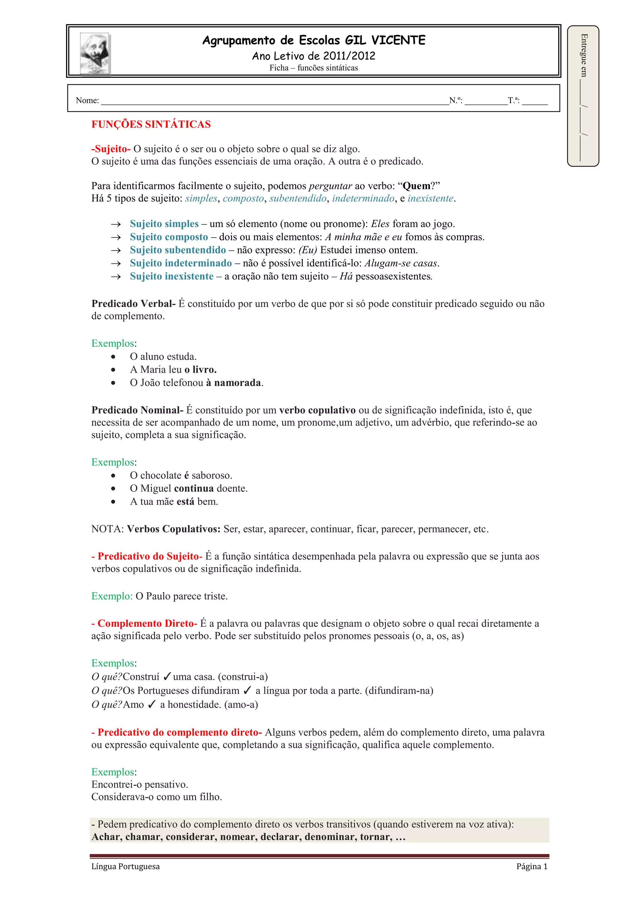 This document defines and provides examples of various syntactic functions in Portuguese including: subject, predicate, direct object, indirect object, circumstantial complement, attribute, apostrophe, and passive agent. It also provides links for students to test their knowledge.