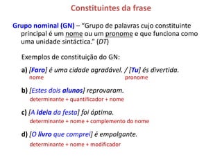 Este documento descreve os principais constituintes da frase e suas funções sintáticas, incluindo: Grupo Nominal, Grupo Verbal, Grupo Adjetival, Grupo Adverbial e Grupo Preposicional. Também explica as funções internas ao Grupo Verbal como Complemento Direto, Indireto, Obríquo, Predicativo do Sujeito e Modificador. Por fim, diferencia Modificador do Grupo Verbal versus Modificador de Frase.