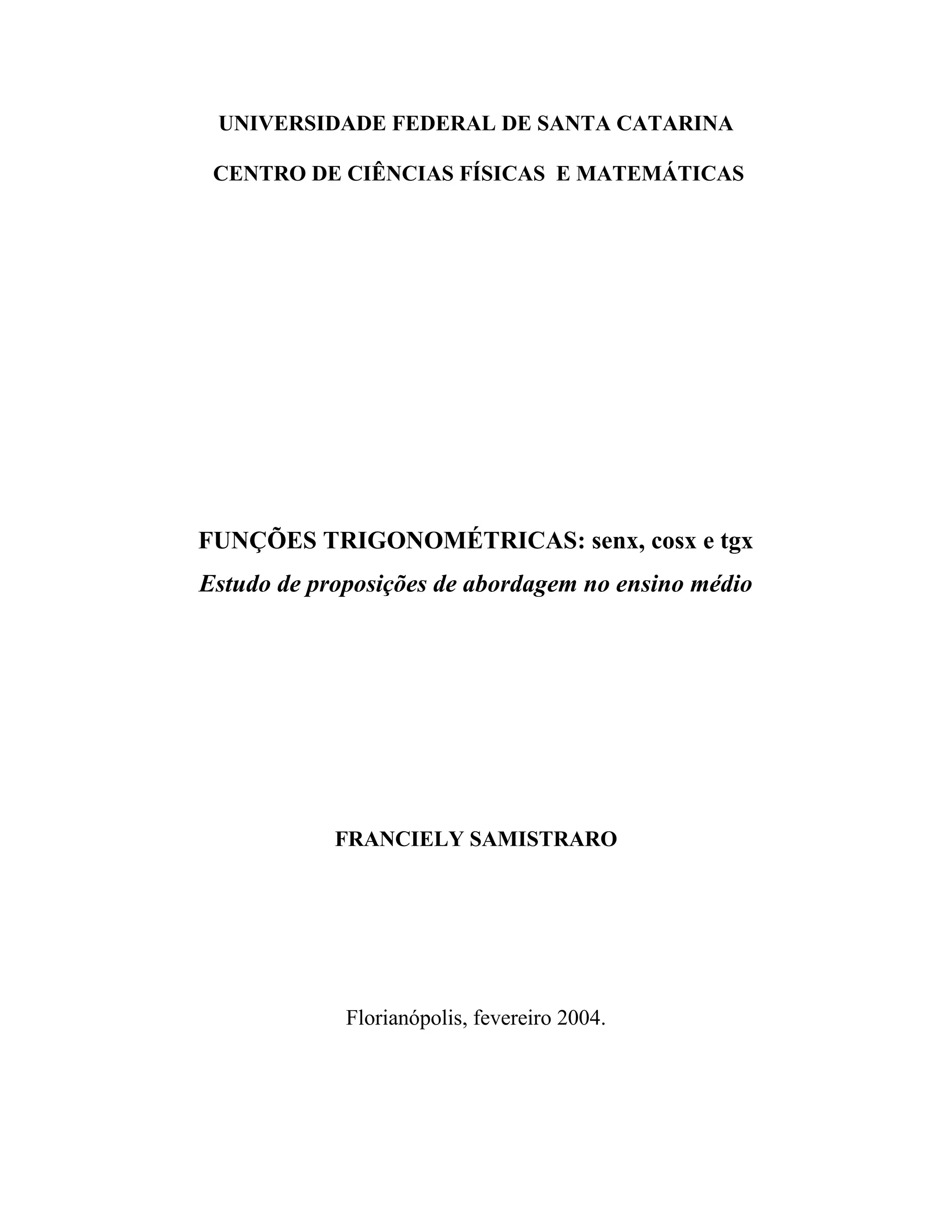 Este documento trata de um estudo sobre as funções trigonométricas sen, cos e tg no ensino médio. Apresenta uma revisão dos parâmetros curriculares nacionais e da proposta curricular de Santa Catarina sobre o assunto, além de abordar brevemente a história da trigonometria. O trabalho analisa como este conteúdo é proposto no saber acadêmico e no saber ensinado, por meio do estudo de livros didáticos e depoimentos de professores.