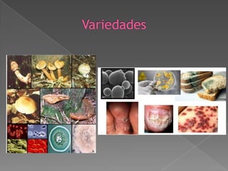 Este documento discute fungos e doenças causadas por fungos no corpo humano. Ele explica que fungos podem causar várias doenças de pele como tinea, candidíase e intertrigo ao se instalarem em áreas quentes e úmidas do corpo. Também fornece dicas para prevenir infecções fúngicas.