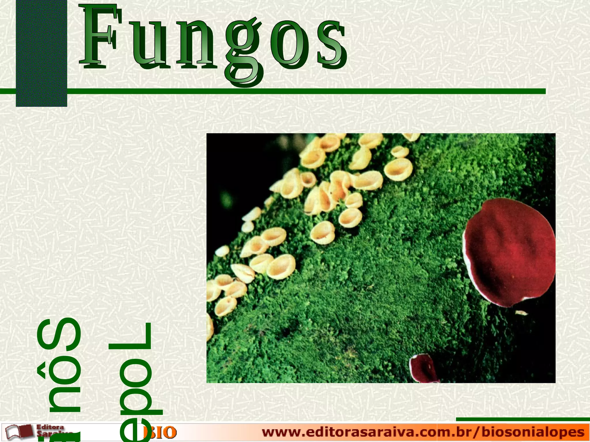 O documento descreve os principais tipos de fungos (Chytridiomycota, Zygomycota, Ascomycota e Basidiomycota) e seu ciclo de vida, incluindo reprodução assexuada e sexuada. Ele explica a estrutura dos esporângios, ascos, basídios e como cada um produz esporos haplóides através da meiose ou fusão nuclear e plasmática.