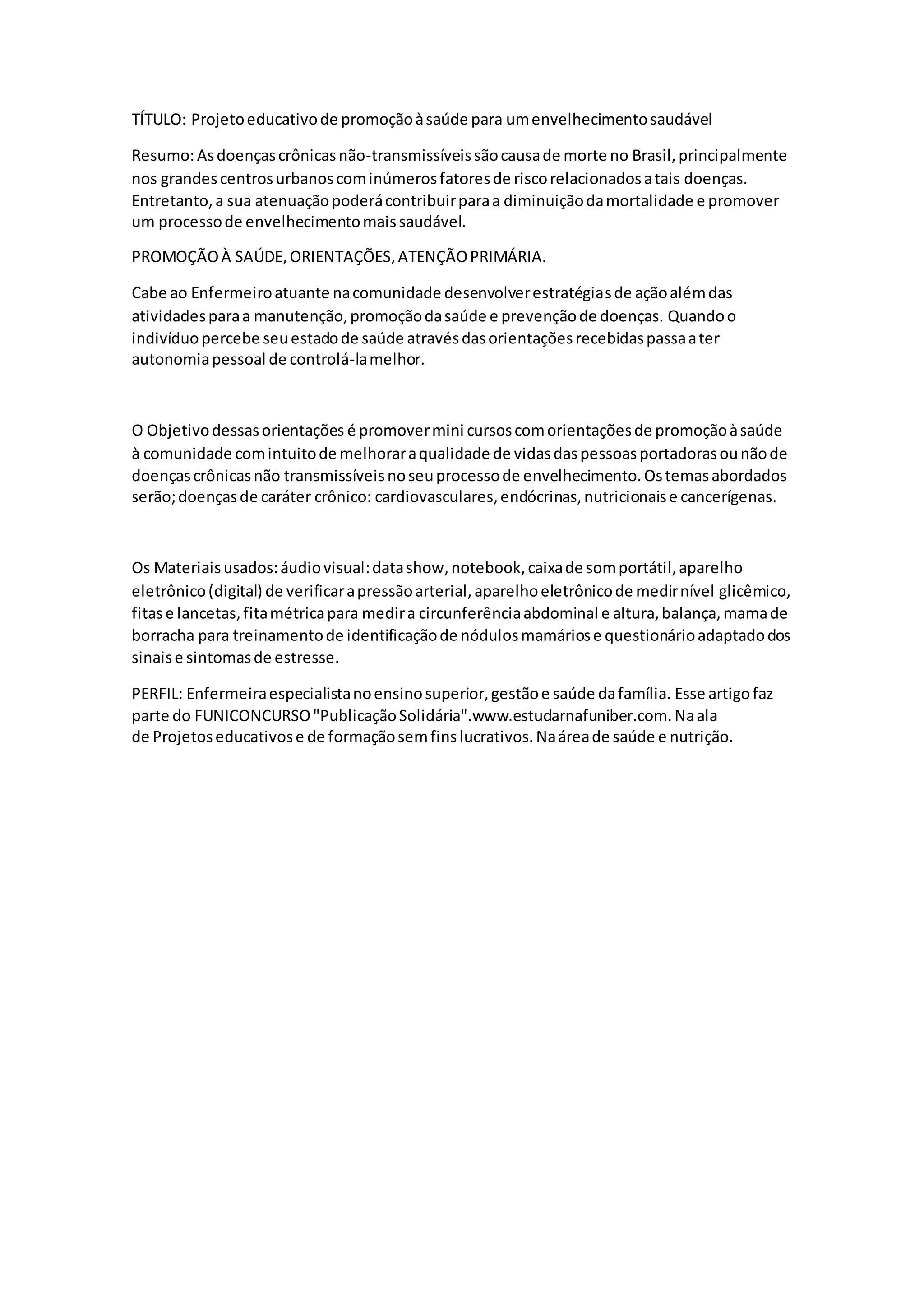 Este projeto educativo visa promover a saúde e um envelhecimento saudável através de mini-cursos orientando a comunidade sobre doenças crônicas e fatores de risco, utilizando recursos audiovisuais e equipamentos para medir pressão arterial, glicemia, circunferência abdominal e altura. O objetivo é melhorar a qualidade de vida das pessoas e dar autonomia no controle de sua saúde.