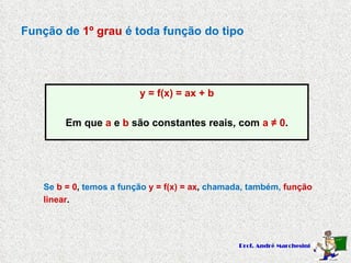 Este documento descreve funções do primeiro grau na forma y=ax+b, onde a e b são constantes. Explica que a é o coeficiente angular e determina se a função é crescente (a>0) ou decrescente (a<0), enquanto b é o coeficiente linear e representa a interseção com o eixo y. Apresenta exemplos de funções do primeiro grau e seus respectivos gráficos.