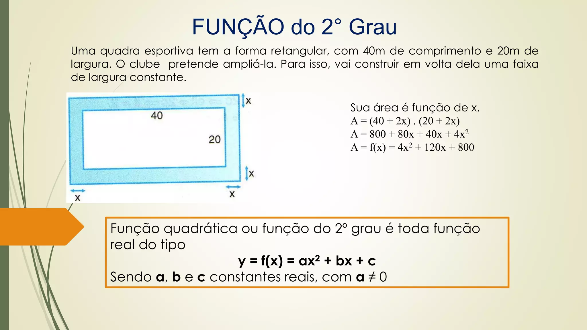 O documento discute funções quadráticas. Explica que uma função quadrática relaciona uma variável independente x com uma variável dependente y através de uma equação do tipo y = ax2 + bx + c, onde a, b e c são constantes. Também mostra como interpretar os gráficos de funções quadráticas e identificar suas propriedades como vértice, raízes e concavidade.