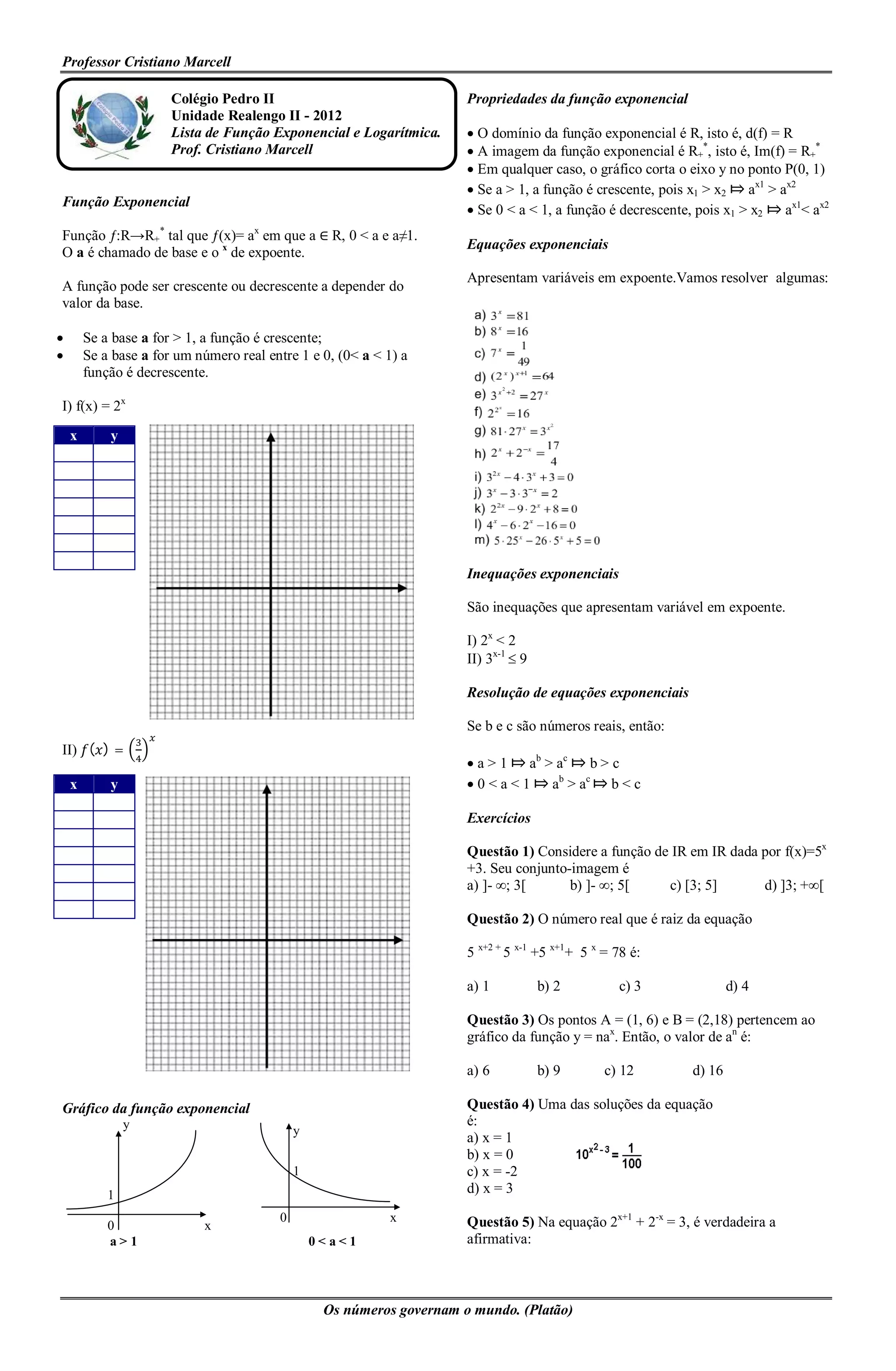 O documento discute as propriedades da função exponencial, incluindo que seu domínio é R, sua imagem é R+*, e corta o eixo y no ponto (0,1). Também aborda como a função pode ser crescente ou decrescente dependendo do valor da base, e fornece exemplos de equações e inequações exponenciais.