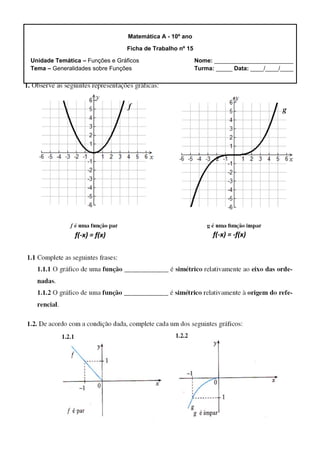 Este documento é uma ficha de trabalho sobre funções e gráficos para o 10o ano. Aborda generalidades sobre funções, incluindo que uma função é injetiva se e só se para elementos diferentes do domínio as imagens também forem diferentes, e graficamente se uma reta horizontal intersectar o gráfico no máximo num ponto.