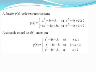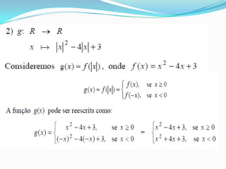 Este documento discute funções modulares e translações gráficas de funções do tipo f(x)=|x|. Explica que a função modular é definida como o valor absoluto de x e tem domínio R e imagem R+. Também mostra como transladar os gráficos de f(x)=|x| para f(x)=|x|+k e f(x)=|x|-k, alterando o eixo y, e para f(x)=|x-k| e f(x)=|x+k|, alterando o eixo x.