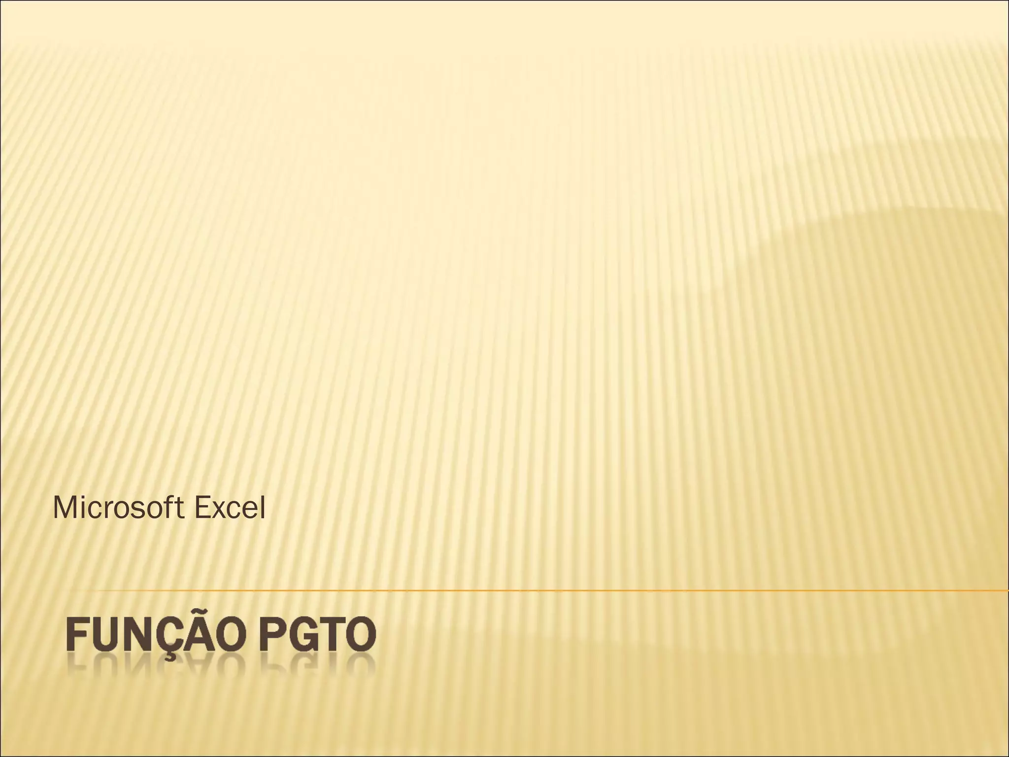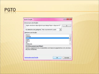 O documento descreve a função PGTO do Excel, que calcula pagamentos periódicos de uma anuidade com taxa de juros constante. A função requer a taxa, número de pagamentos, valor presente, valor futuro e tipo. É usada para calcular a parcela mensal de R$400.000 financiados a 2% ao mês por 20 anos, resultando em R$8.069,63 por mês.