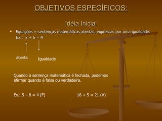 Este documento descreve um projeto de ensino sobre funções do 1o grau para alunos do 9o ano do ensino fundamental. O projeto tem como objetivos específicos definir igualdades, expressões numéricas e funções afins, e apresentar seus respectivos gráficos. Também pretende promover a interdisciplinaridade com física e estimular a interação entre os alunos por meio de atividades em grupo.
