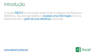 A função PROC V é uma ferramenta de pesquisa e referência no Excel, utilizada para localizar informações em tabelas a partir de um valor conhecido. A sintaxe da função é =PROCV(valor_procurado; matriz_tabela; núm_índice_coluna; procurar_intervalo), permitindo tanto correspondências exatas quanto aproximadas. O documento também inclui links úteis e uma seção prática para exercícios.