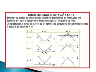 Estas funções quadráticas podem ser positivas, negativas ou nulas dependendo dos valores de x. Para determinar os sinais, é necessário calcular o valor de x que faz cada função igual a zero e verificar os sinais à esquerda e à direita desses valores.