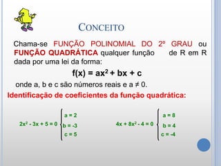 O documento descreve as características e propriedades das funções quadráticas. Uma função quadrática é definida como f(x) = ax2 + bx + c, onde a, b e c são números reais e a ≠ 0. O gráfico de uma função quadrática é uma parábola, que pode ter concavidade para cima ou para baixo. As raízes de uma função quadrática podem ser encontradas usando a fórmula de Bhaskara, e dependem do sinal do discriminante ∆.