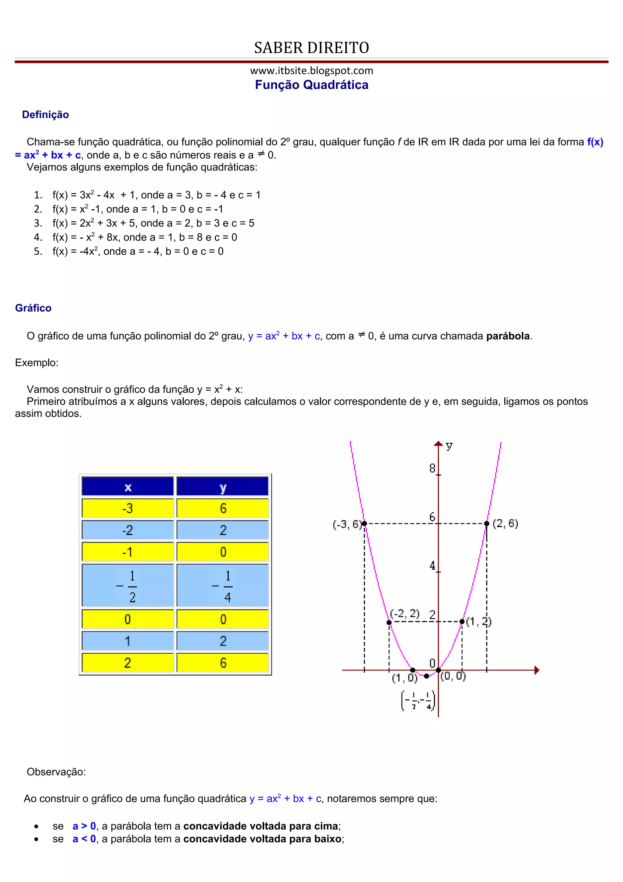 1) Uma função quadrática é uma função polinomial do 2o grau da forma f(x)=ax2+bx+c, onde a, b e c são números reais e a ≠ 0. O gráfico de uma função quadrática é uma parábola.