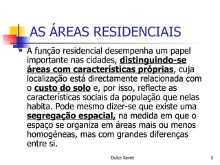 O documento discute a diferenciação funcional das áreas urbanas, especificamente as áreas residenciais e industriais. Descreve como as áreas residenciais são segregadas de acordo com a classe social, desde áreas de luxo para ricos até áreas sociais para pobres. Também explica como a indústria tem se deslocado para fora das cidades devido ao custo do solo e necessidade de espaço, resultando na formação de novas áreas industriais na periferia.