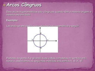 1) O documento descreve as características de uma circunferência trigonométrica, incluindo sua definição, convenções e propriedades.