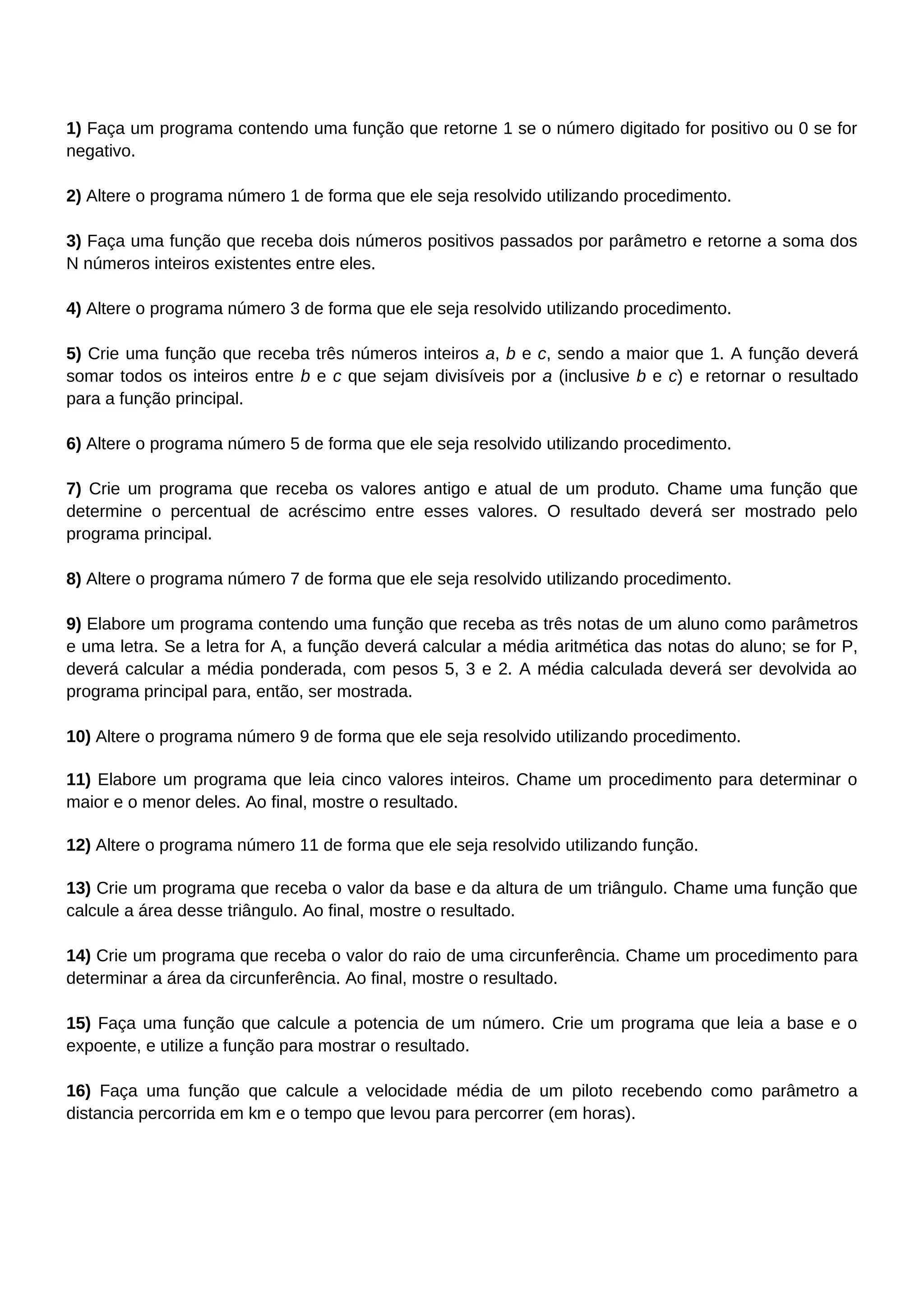 O documento apresenta 16 exercícios sobre funções e procedimentos em programação. Os exercícios 1-8 envolvem converter programas que usam funções para usar procedimentos e vice-versa. Os exercícios 9-16 envolvem criar programas que chamam funções ou procedimentos para realizar cálculos e mostrar os resultados, como cálculo de médias, áreas, potências e velocidade média.