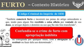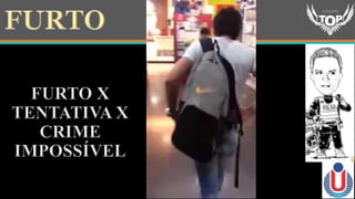 - O documento discute os crimes contra o patrimônio, especificamente o crime de furto definido no Código Penal brasileiro. Aborda os elementos do tipo penal do furto, suas qualificadoras, causas de diminuição e aumento de pena.