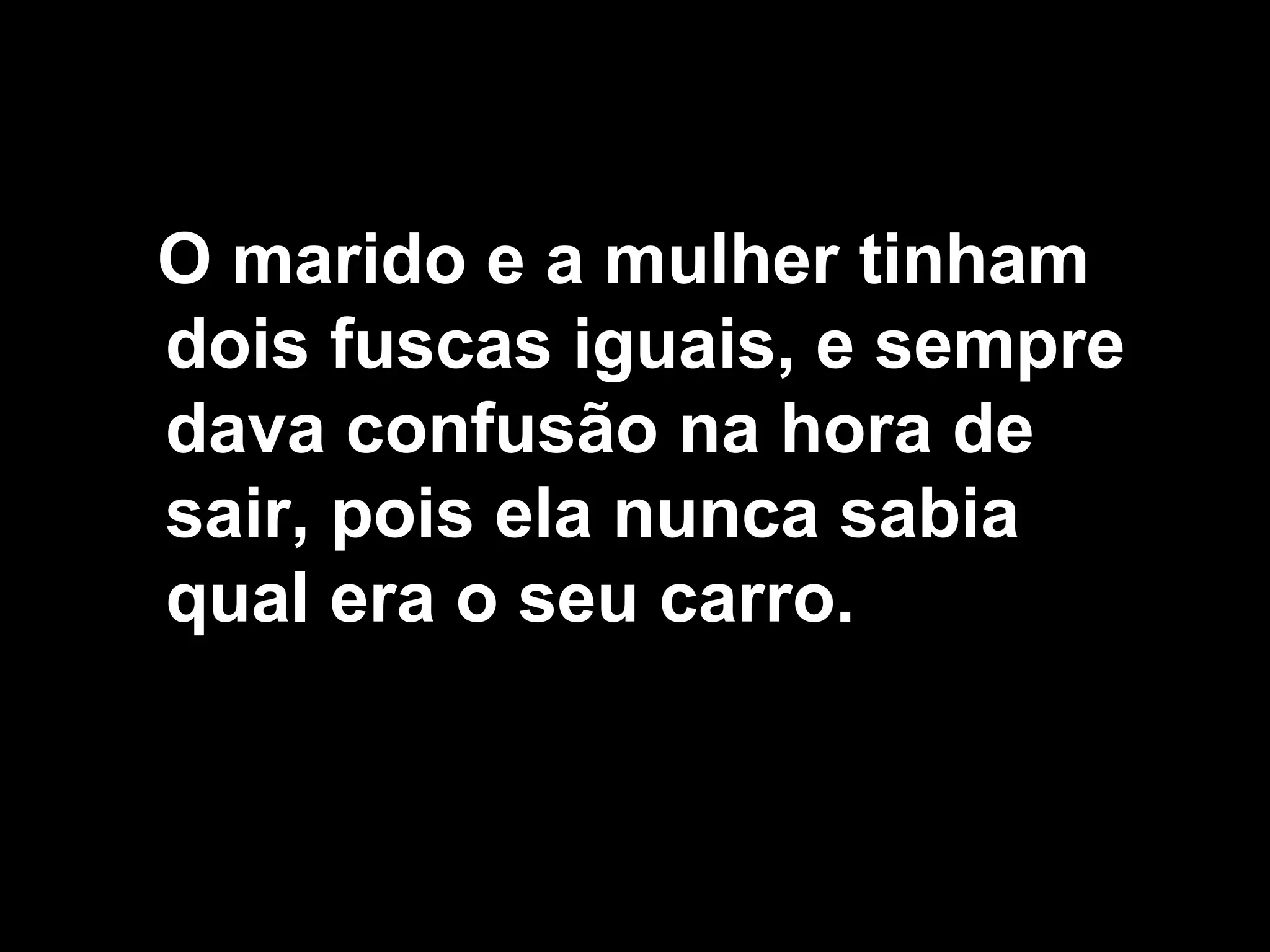 Um casal tinha dois fusca iguais que sempre causavam confusão para saber qual era de cada um. Para resolver o problema, o marido pintou os carros para que agora não houvesse mais engano na hora de escolher o veículo correto.