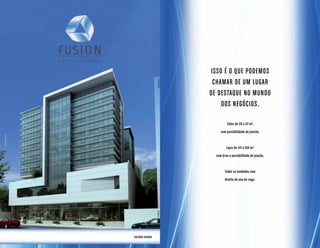 O documento descreve as características e especificações do edifício Fusion Office Tower localizado na Avenida Geremário Dantas em Jacarepaguá, Rio de Janeiro. O prédio possui 11 pavimentos com 235 salas comerciais e 5 lojas, além de espaços de lazer como academia, spa e café. As unidades possuem segurança 24 horas e infraestrutura sustentável.