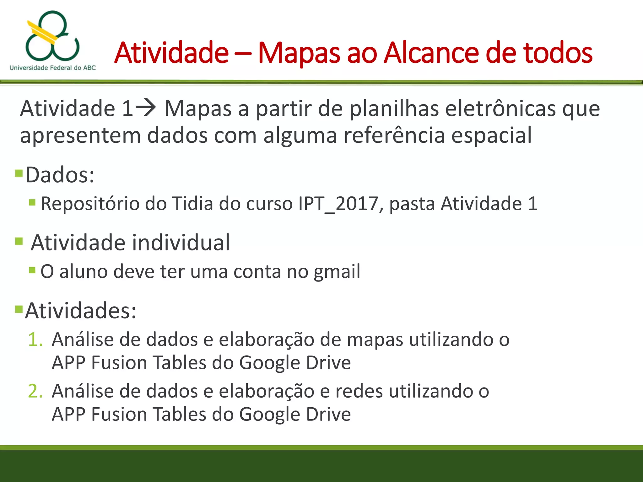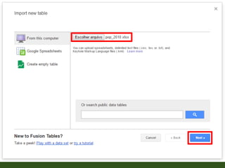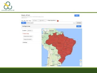 Este documento apresenta uma atividade sobre mapas e dados espaciais utilizando planilhas eletrônicas e a ferramenta Fusion Tables do Google Drive. A atividade propõe que os alunos mapeiem dados de população brasileira por unidade da federação usando o Power Maps no Excel e em seguida analisem dados de migração entre estados usando mapas e redes no Fusion Tables.