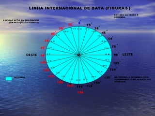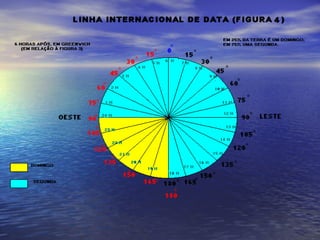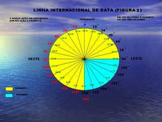1) O documento explica a origem e função dos fusos horários, dividindo a Terra em 24 zonas de tempo com 15° cada.