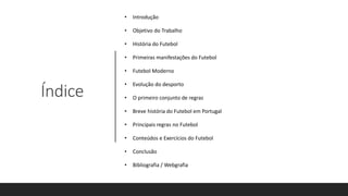 O documento aborda a história e a evolução do futebol, desde suas origens na Antiguidade até a formalização de suas regras e estrutura organizacional moderna. Destaca a importância do futebol como um esporte coletivo e suas principais regras, incluindo aspectos técnicos, posicionais e de arbitragem. Também menciona a introdução do futebol em Portugal e a fundação da Federação Portuguesa de Futebol.