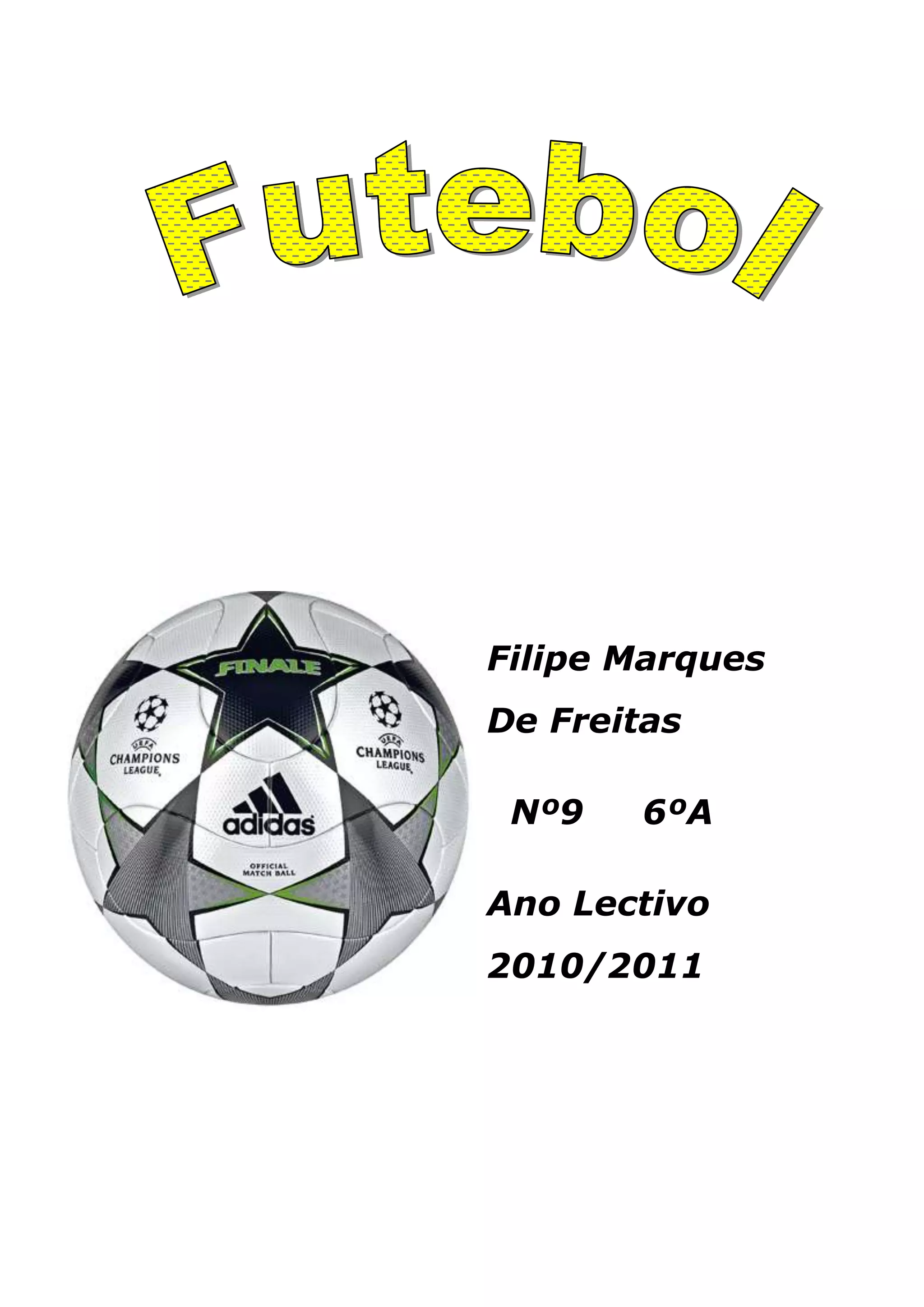 -527685375285<br />Filipe MarquesDe Freitas<br /> Nº9 6ºA<br />Ano Lectivo 2010/2011 <br /> <br />Índice<br />IntroduçãoHistórias do futebol-Origens do futebol na China antiga -O futebol da idade media-O futebol chega a Inglaterra-A historia do futebol português-O primeiro estádio- A ascensão do futebol- O primeiro campeonatoGestos técnicos do Futebol<br /> Introdução<br />O futebol é um dos desportos mais populares no mundo. Praticado em centenas de países, este desporto desperta interesse em função de sua forma de se disputar a bola.<br />Embora não se tenha muita certeza sobre os primórdios do futebol, historiadores descobriram vestígios dos jogos com bolas em várias culturas antigas. Estes jogos de bola ainda não eram denominados como futebol, pois não havia a definição de regras como há hoje, porém demonstram o interesse do homem por este tipo de desporto desde os tempos antigos.<br />O futebol tornou-se tão popular graças a sua simples maneira de jogar. Basta uma bola, duas equipas e a baliza, para que, em qualquer lugar, crianças e adultos possam divertir-se a jogar futebol. Na rua, na escola, ou até mesmo no quintal de casa, desde cedo jovens de vários cantos do mundo começam a praticar futebol.<br />História do Futebol<br />Origens do futebol na China Antiga<br />Na China Antiga, por volta de 3000 a.C., os militares chineses praticavam um jogo que na verdade era um treino militar. Após as guerras, formavam equipas para chutar a cabeça dos soldados inimigos. Com o tempo, as cabeças dos inimigos foram sendo substituídas por bolas de couro revestida com cabelo. <br />Formava-se duas equipas com oito jogadores e o objectivo era passar a bola de pessoa em pessoa sem deixar cair no chão, levando-a para dentro de duas estacas fincadas no campo. Estas estacas eram ligadas por um fio de cera.<br />O futebol na Idade Média<br />Há relatos de um desporto muito parecido com o futebol, embora se usava-se muito a violência.<br />O Soule ou Harpastum era praticado na Idade Média por militares que se dividiam em duas equipas: atacantes e defesas. Era permitido dar socos, pontapés, rasteiras e outros golpes violentos. Há relatos que mostram a morte de alguns jogadores durante a partida. Cada equipa era formada por 27 jogadores, onde as equipas tinham funções diferentes no campo.<br />O futebol chega à Inglaterra<br />Pesquisadores concluíram que o futebol chegou a Inglaterra por volta do século XVII.<br />Na Inglaterra, o jogo ganhou regras diferentes e foi organizado e sistematizado. O campo deveria medir 120 por 180,00 m e nas duas pontas seriam instalados dois arcos rectangulares chamados de baliza. A bola era de couro e enchida com ar. Com regras claras e objectivas, o futebol começou a ser praticado por estudantes e filhos da nobreza inglesa. Aos poucos foi se popularizando.<br />No ano de 1848, numa conferência em Cambridge, estabeleceu-se um único código de regras para o futebol.<br />No ano de 1871 foi criada a figura do guarda-redes que seria o único que poderia colocar as mãos na bola e deveria ficar próximo à baliza para evitar a entrada da bola.<br />Em 1875, foi estabelecida a regra do tempo de 90 minutos e em 1891 foi estabelecido o penalti, para castigar a falta dentro da área.<br />O profissionalismo no futebol foi iniciado apenas em 1885 e no ano seguinte seria criada, na Inglaterra, a International Board, entidade cujo objectivo principal era estabelecer e mudar as regras do futebol se fosse necessário.<br />No ano de 1897, uma equipa de futebol inglesa chamada Corinthian fez uma excursão fora da Europa, contribuindo para difundir o futebol em diversas partes do mundo.<br />Em 1888, foi fundada a Football League com o objectivo de organizar torneios e campeonatos internacionais.<br />No ano de 1904, foi criada a FIFA (Federação Internacional de Futebol Association) que organiza até hoje o futebol em todo mundo. É a FIFA que organiza os grandes campeonatos de selecções (Campeonato do Mundo) de quatro em quatro anos. <br />A história do futebol português<br />O futebol moderno foi introduzido em Portugal em 1884 por Guilherme Pinto Basto, que havia regressado recentemente de Inglaterra. No entanto, foi preciso esperar quatro anos para que se realizasse o primeiro jogo oficial, nos arredores de Lisboa, na pitoresca vila costeira de Cascais.<br />O primeiro estádio<br />O arranque do futebol como um fenómeno popular manteve-se discreto, até que em 1893 um grupo de Cascais aproveitou para formar uma equipa constituída por expatriados ingleses. Nesse mesmo ano foi construído o primeiro campo de futebol no centro de Lisboa, no Campo Pequeno, no local onde hoje se encontra a Praça de Touros.<br />A ascensão do futebol<br />Rapidamente começaram a surgir vários clubes, o primeiro dos quais o Lisbonense, ao que rapidamente se seguiram o Real Ginásio Clube, o Carcavelos Clube e o Cabo Submarino, de exilados ingleses. <br />Em 1894, o Rei D. Carlos I patrocinou um jogo de equipas representantes do Norte e do Sul, sendo que em 1910 existiam já três associações regionais com sede em Lisboa, Porto e Portalegre, que se fundiram numa só, quatro anos mais tarde.<br />O primeiro campeonato<br />A I Grande Guerra Mundial travou o desenvolvimento do futebol, mas em 1921 assistiu-se ao primeiro encontro internacional de Portugal, que redundou numa derrota por 3-1 frente a Espanha, e à realização do primeiro campeonato nacional, uma competição por eliminatórias ganha pelo FC Porto, em Junho.<br />Em 1926, foi fundada a Federação Portuguesa de Futebol, e o desporto ganhou raízes fortes na sociedade.<br />Gestos técnicos do Futebol<br />Passe<br />Diferentes comentários do conceito de passe:<br />O passe de acordo com Ferreira é a \"