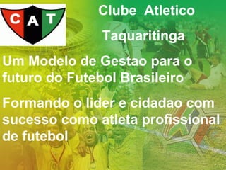 O documento descreve o plano de gestão de um clube de futebol brasileiro chamado Clube Atletico Taquaritinga (CAT). O plano inclui a formação de jovens atletas, educação em futebol, gestão de negócios e expansão global da marca CAT.