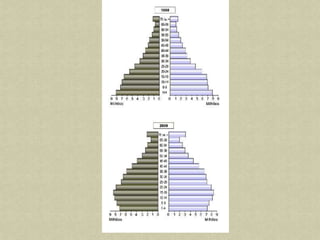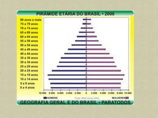 O documento discute o envelhecimento da população brasileira, com destaque para os estados da Bahia, São Paulo e Minas Gerais que têm as maiores concentrações de pessoas com 100 anos ou mais. Também menciona que a cidade de São Paulo tem 1.027 centenários e lista consequências e objetivos relacionados ao envelhecimento da população como a adaptação da cidade e a promoção de uma vida saudável e ativa para os idosos.