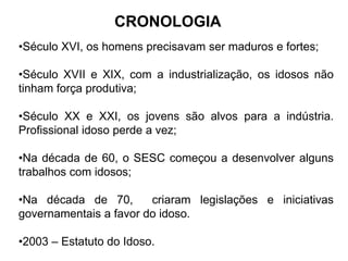 O documento discute a evolução histórica da percepção da velhice ao longo dos séculos, desde ser vista como sinal de maturidade e força no século XVI até ser marginalizada com a industrialização. Também descreve a criação de leis e programas para promover o direito dos idosos à dignidade no Brasil a partir da década de 1970, culminando no Estatuto do Idoso de 2003.