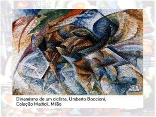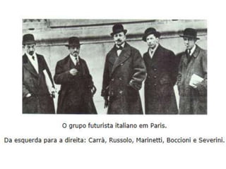 O documento descreve o movimento artístico futurista na Europa no início do século XX, destacando seus principais características, pintores como Balla, Carra e Boccioni, e sua influência na arquitetura, escultura, música e teatro, assim como no Brasil com artistas como Anita Malfatti e Mário de Andrade.