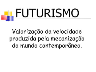 Procura-se neste estiloexpressar o movimento atual, registrando a velocidade descrita pelas figuras em movimento no espaço. O artista futurista não está interessado em pintar um automóvel, mas captar a forma plástica a velocidade descrita por ele no espaço.
