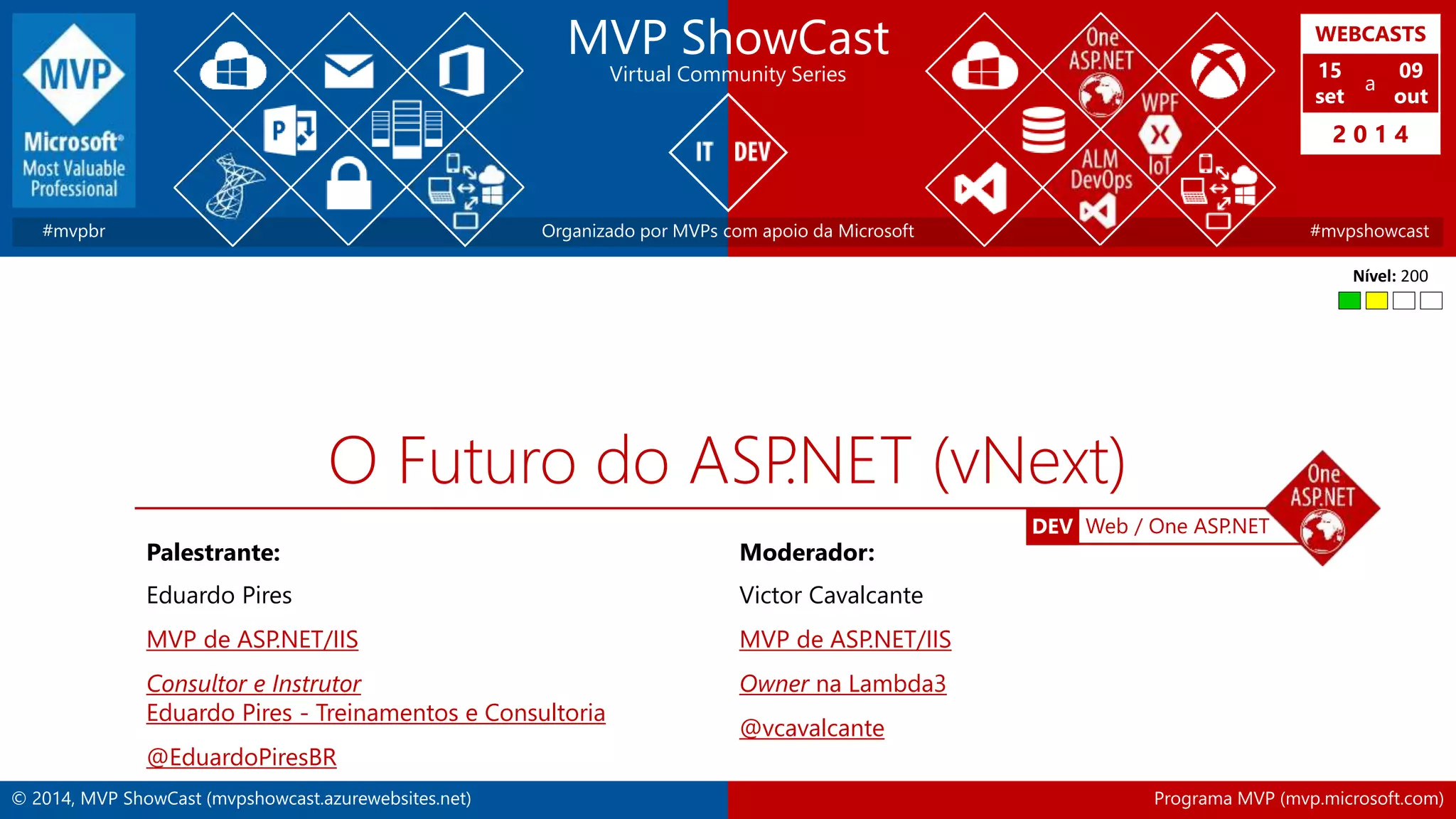 O documento descreve um webcast sobre o futuro do ASP.NET que irá discutir a evolução do framework, a arquitetura OWIN/Katana e a nova versão ASP.NET vNext. O webcast será conduzido por dois MVPs da Microsoft e incluirá demonstrações.
