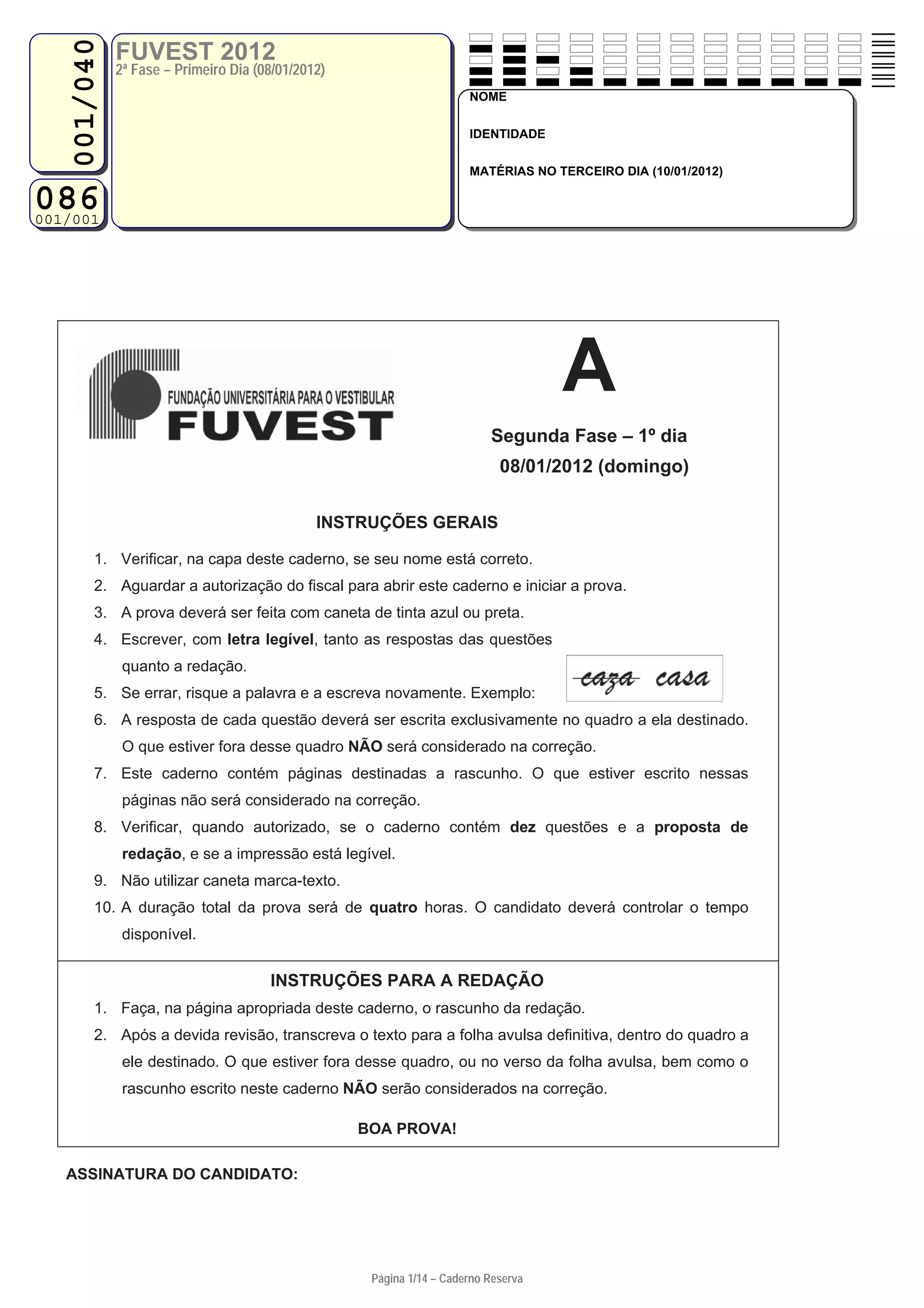 Este documento contém instruções gerais para a segunda fase da Fuvest de 2012, incluindo informações sobre a identificação do candidato, regras da prova, instruções para a redação e assinatura do candidato.