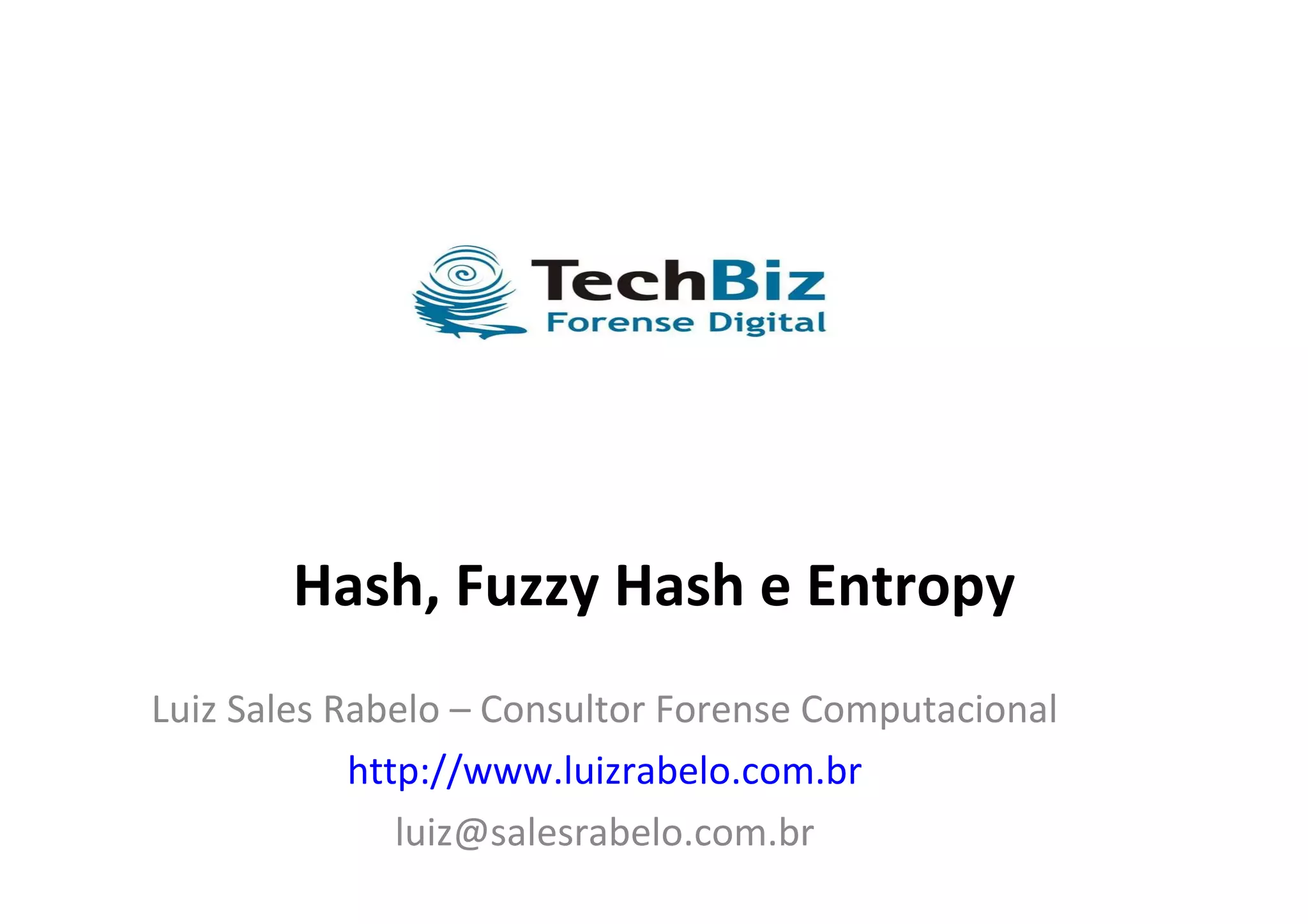 Este documento discute conceitos como hash, fuzzy hash e entropia e como eles são usados na análise forense digital. Ele explica que fuzzy hash descreve uma aplicação baseada em hash tradicionais para verificar se arquivos são semelhantes. Também explica que entropia mede desordem em sistemas e é usada na análise forense para comparar arquivos e verificar se são semelhantes. O documento descreve um algoritmo chamado Entropy Near-Match Analyzer que usa entropia e fuzzy hashing para comparar arquivos de forma rápida e