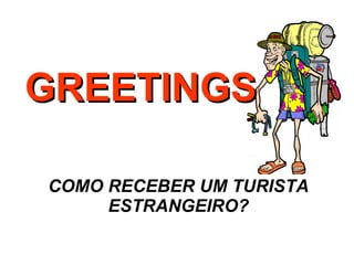 Este documento fornece frases básicas em português para receber turistas estrangeiros, incluindo como cumprimentar, perguntar o nome, como está a pessoa, e dizer adeus.
