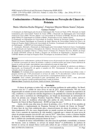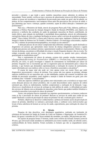 O documento descreve um estudo sobre os conhecimentos e práticas de homens em relação à prevenção do câncer de próstata. Os resultados mostraram que 51,5% dos homens pesquisados desconheciam o câncer de próstata, e que 57,6% procuravam os serviços de saúde regularmente, mas 33,4% se sentiam constrangidos com o exame de toque retal.
