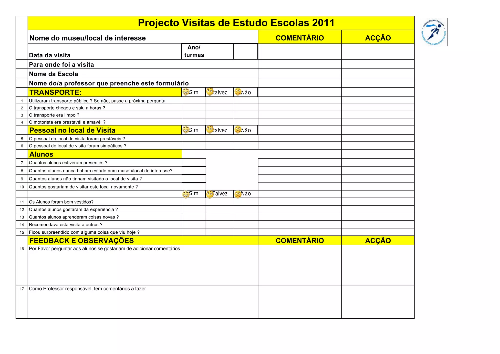 2) Inclui perguntas sobre o transporte, pessoal no local visitado, alunos e feedback sobre a experiência.