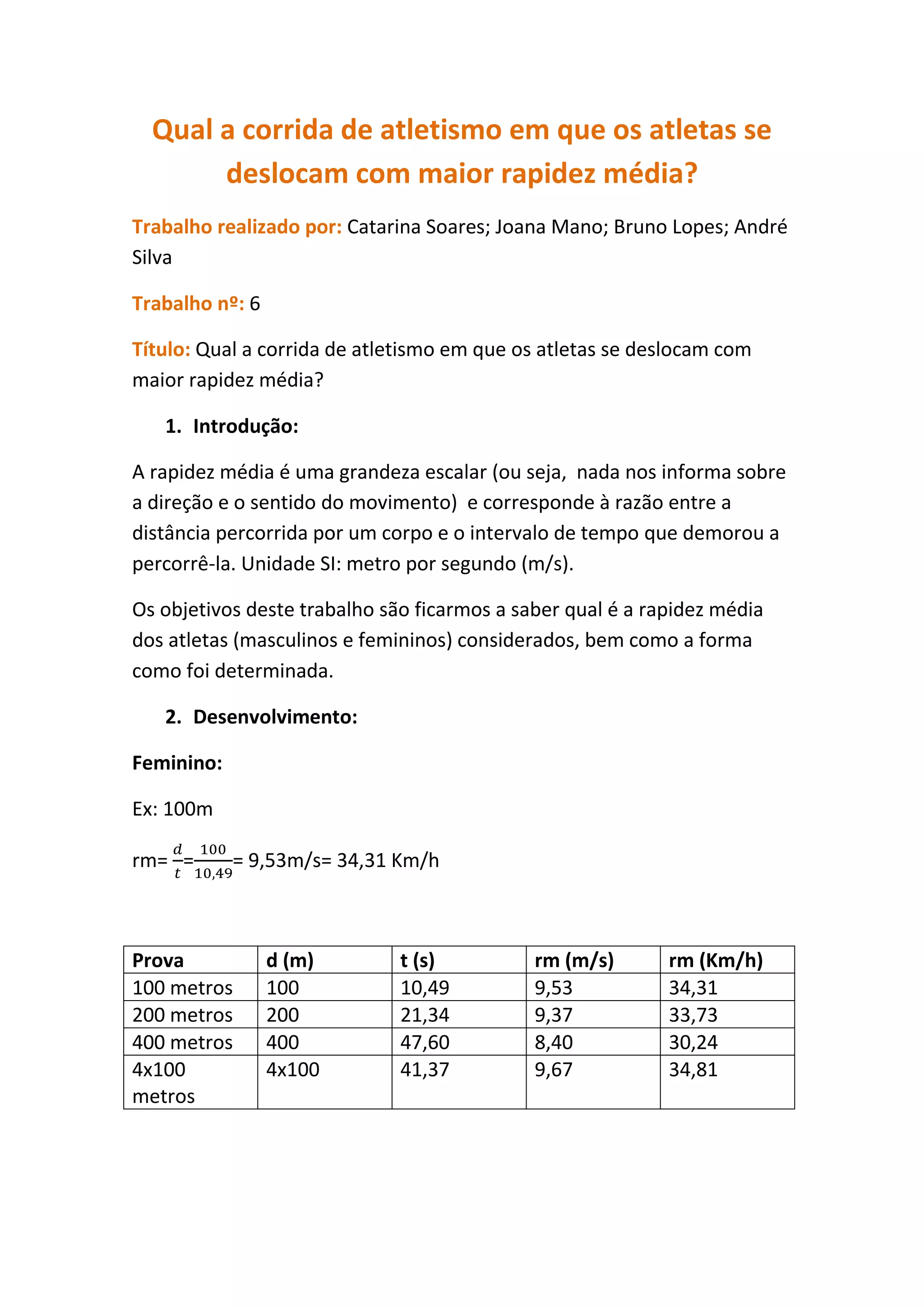 Este documento discute as corridas de atletismo em que os atletas se deslocam com a maior rapidez média. Na categoria feminina, a corrida com a maior rapidez média é o 4x100 metros, com uma velocidade de 9,67 m/s. Na categoria masculina, também é o 4x100 metros, com uma velocidade de 10,7 m/s.
