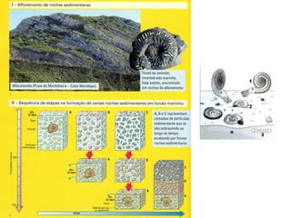 Este documento discute os fósseis e o processo de fossilização. Resume os principais tipos de fósseis (somatofóssil e icnofóssil), os processos de fossilização (moldagem, mineralização e conservação), e dá exemplos como os braquiópodes e rudistas.