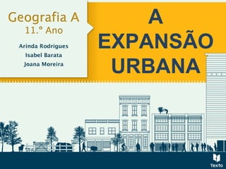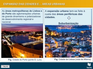 O documento discute a expansão urbana em Portugal, com foco nas áreas metropolitanas de Lisboa e Porto. A expansão urbana tem ocorrido principalmente nas áreas periféricas das cidades, um processo conhecido como suburbanização. As áreas metropolitanas de Lisboa e Porto concentram grande parte da população e atividades econômicas do país e têm experimentado crescimento demográfico e urbanização contínuos.