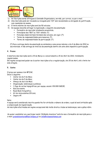 O evento "Grândola Aventura" ocorre de 4 a 6 de maio na região de Grândola e envolve atividades de aventura, navegação e fotografia. As equipes devem ter entre 2 e 4 pessoas em veículos todo-o-terreno equipados com extintor e kit médico. É obrigatório o uso de um GPS Garmin e uma câmera digital. As inscrições custam 87,5€ por pessoa e incluem refeições e materiais para o evento.